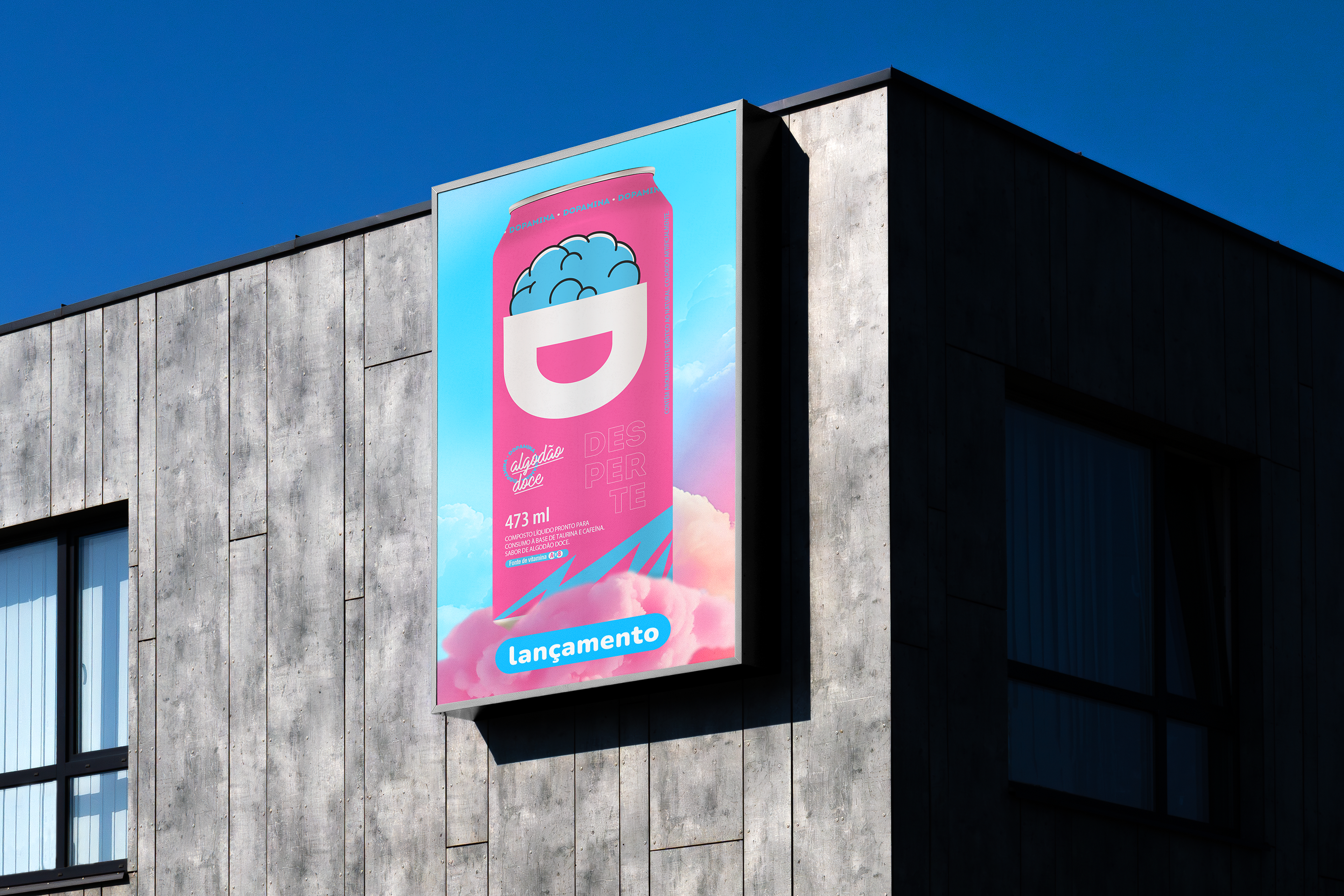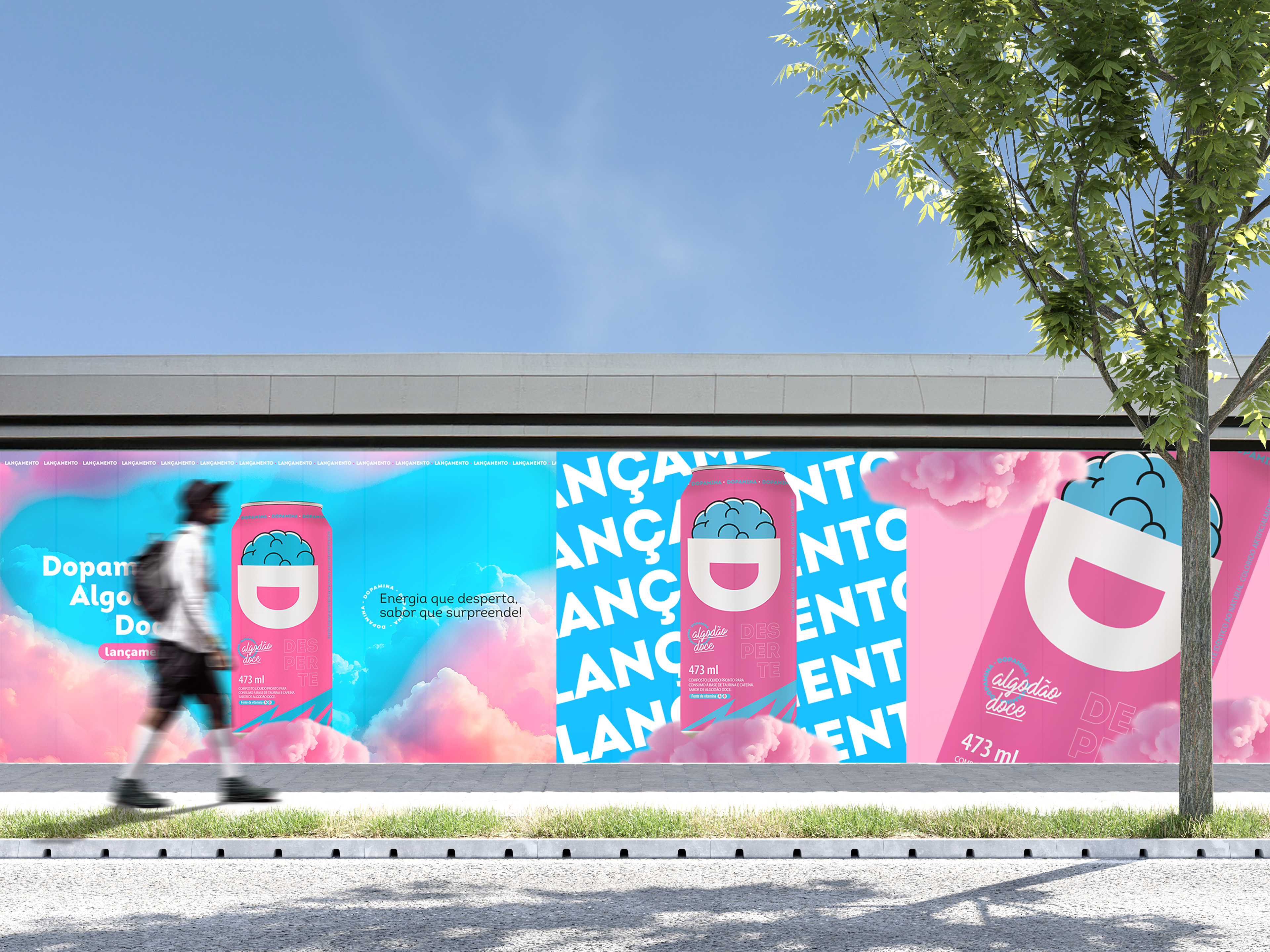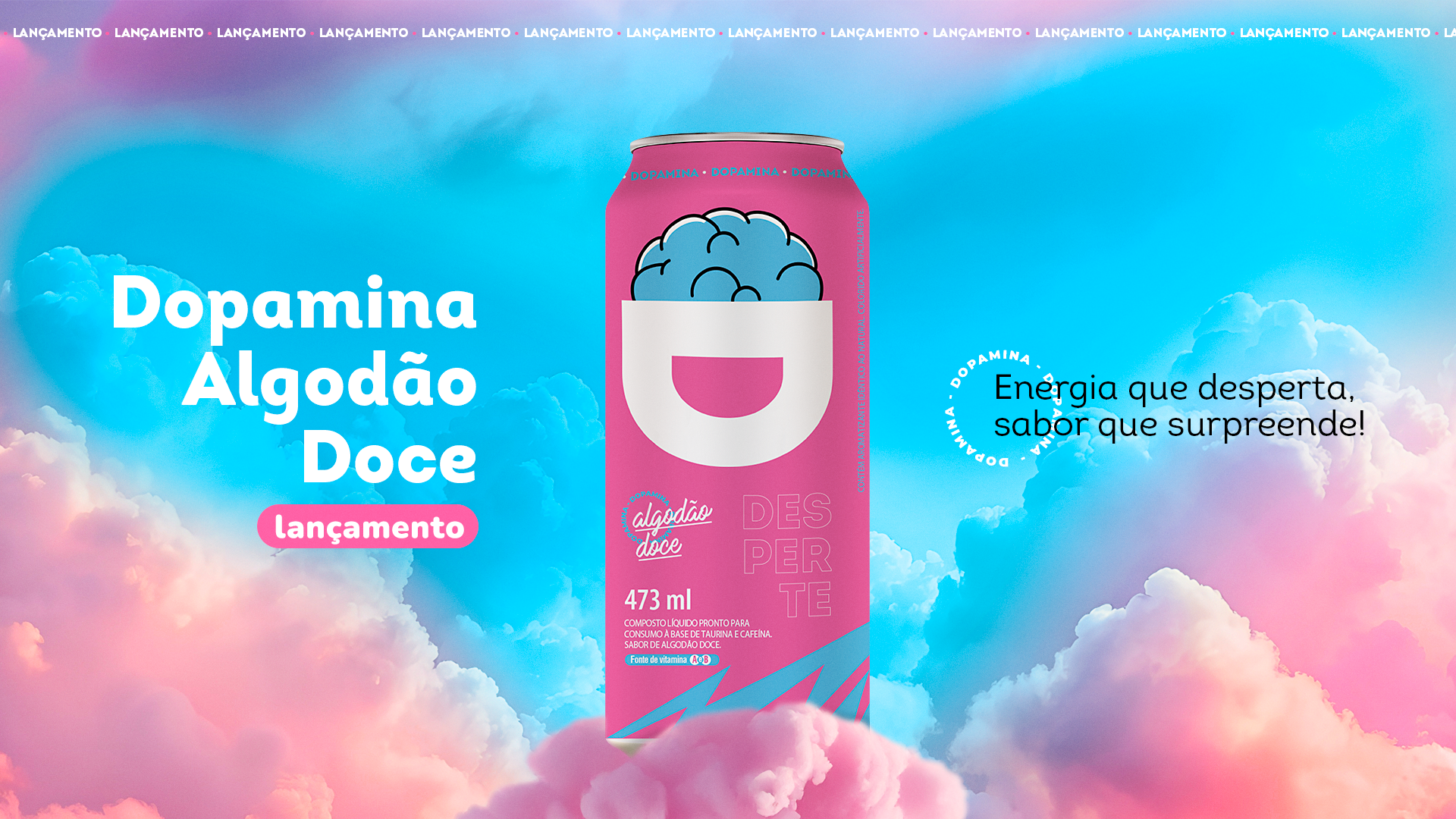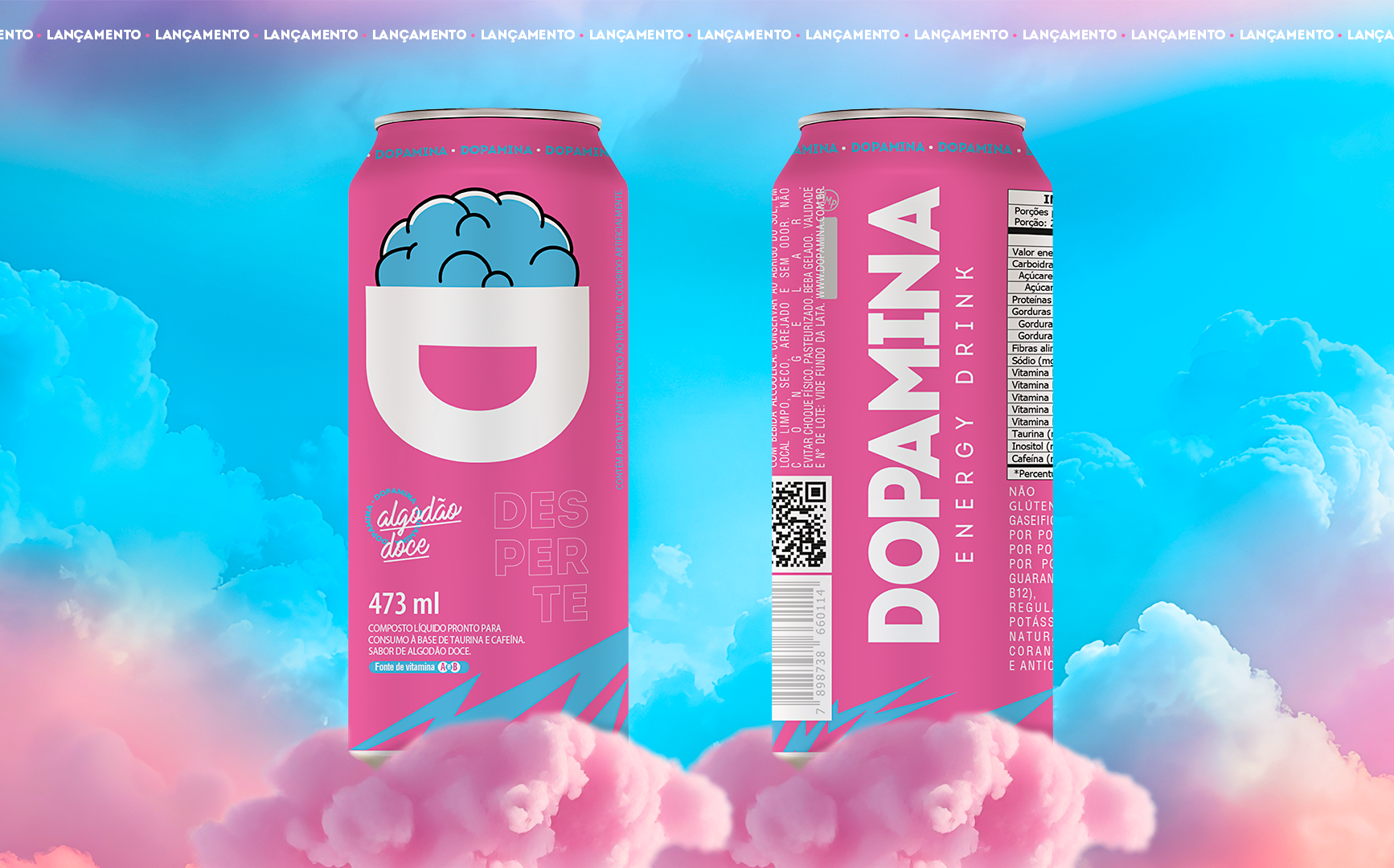 Criação da embalagem e identidade visual do energético Dopamina Algodão Doce – um novo sabor irresistível que desperta sua energia!